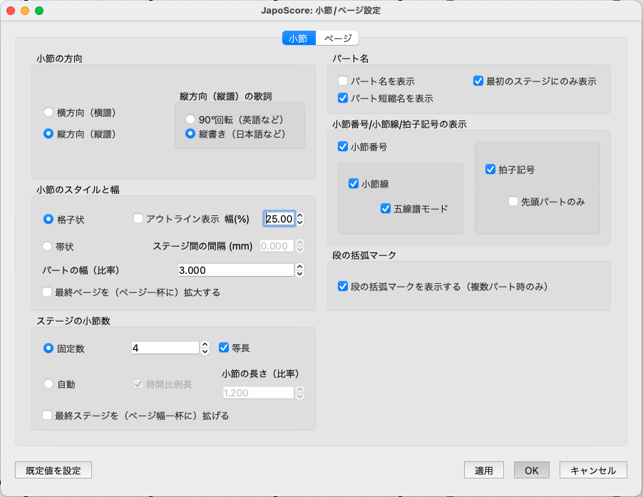 横書き/縦書きの設定、小節のスタイル、ステージ当たりの小節数など、小節のレイアウト設定について説明します。