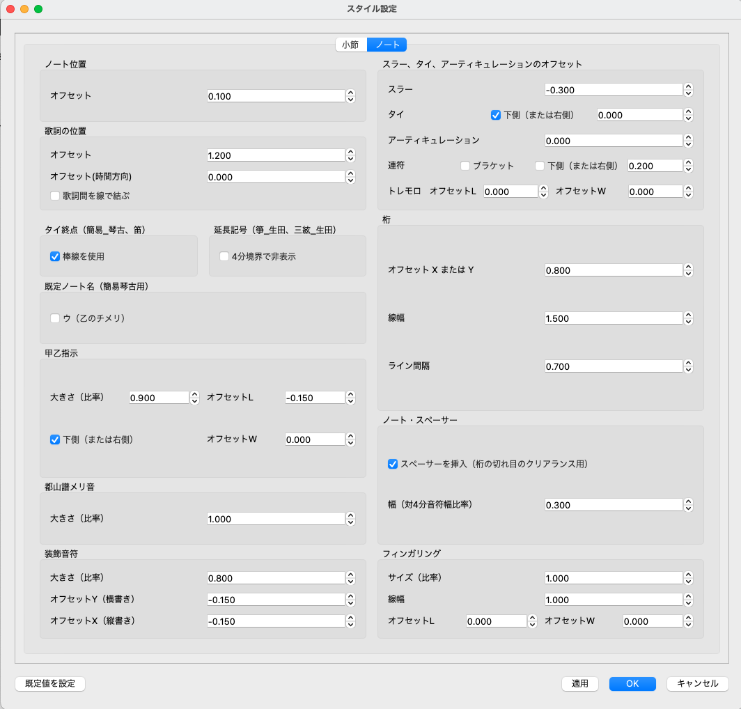 箏・三絃(三味線)では音階(スケール)をノートに割り付ける必要があります。ファイルから割り当てる場合のサンプルファイル(“ScaleTemplates.musicxml”)をインストールファイルに含めましたのでご利用ください。